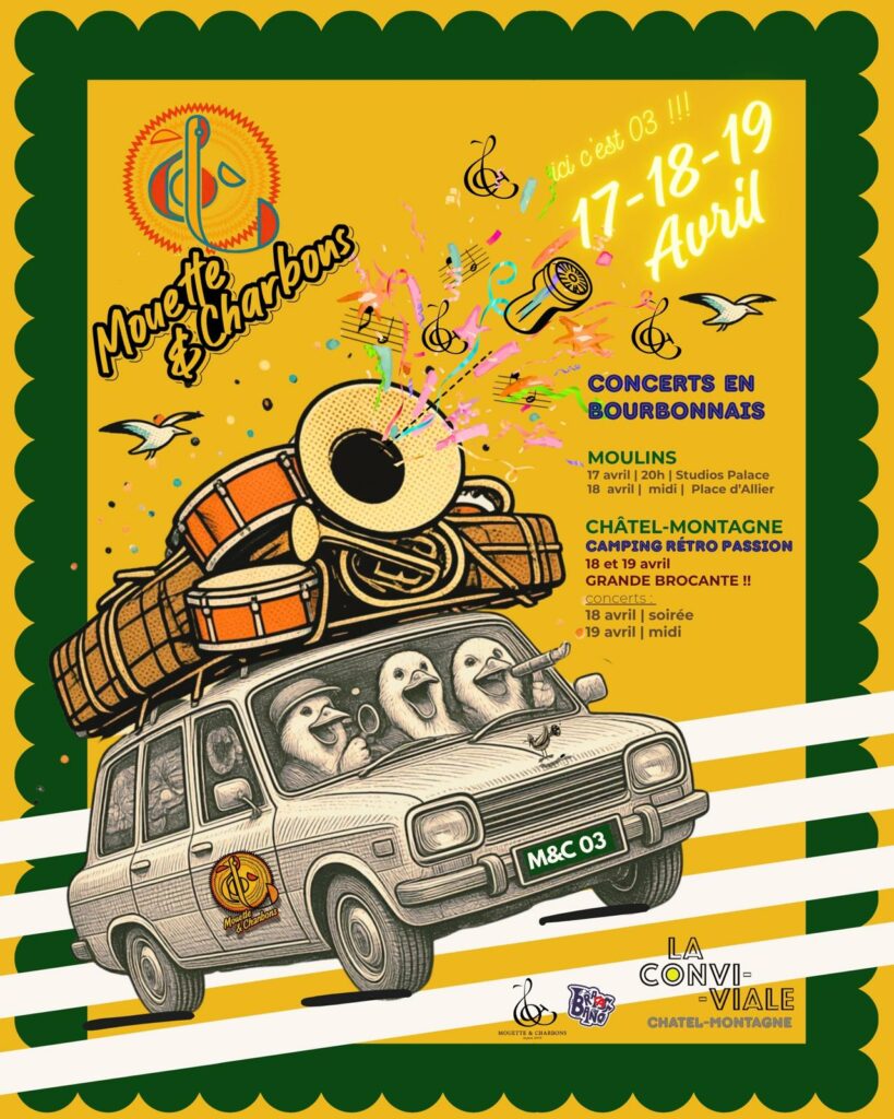 Les Mouette & Charbons ont eu le plaisir de faire un week end dans l’alliers le 17-19 Avril 2026, plus précisement à Moulins et Chatel-Montagne ! Quel accueil et quelle région ! On a hâte d’y retourner !